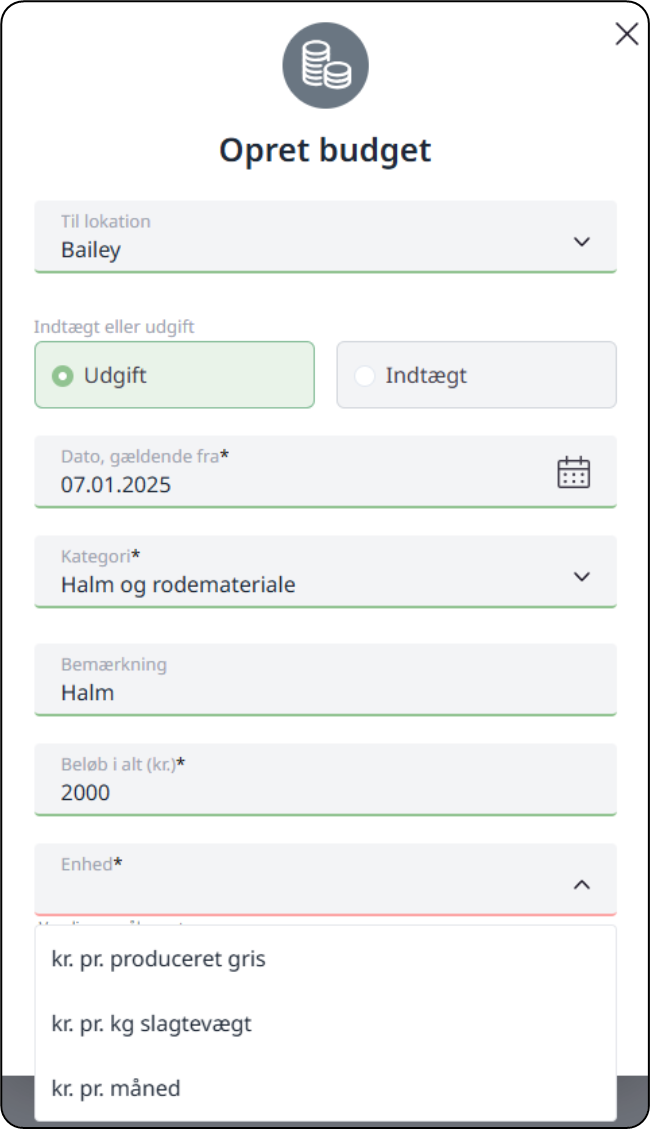 Til sidst vælges en enhed, som har betydning for hvordan budgetposten belaster grisene