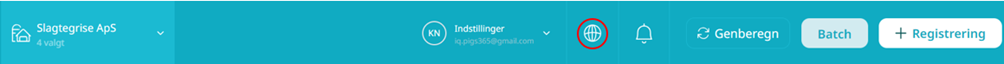 Du kan skifte sprog ved at klikke på globussen ved siden af "Indstillinger".