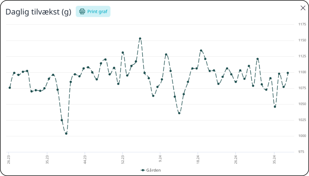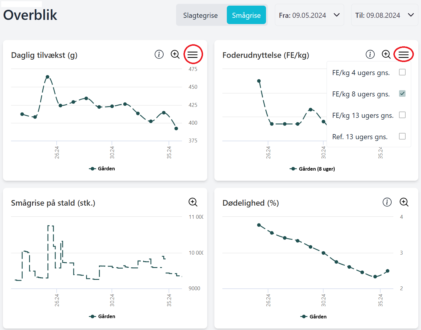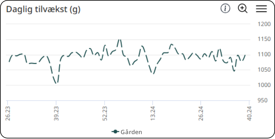 Ved at klikke på de tre streger i øverste højre hjørne på graferne ”Daglig tilvækst” og ”Foderudnyttelse” får du mulighed for at vælge at få vist flere parametre. På grafen ”Daglig tilvækst” kan du vælge at få vist referencetilvæksten, og på grafen ”Foderudnyttelse” har du mulighed for at vælge 4, 8 og 13-ugers foderudnyttelse, samt 13 ugers reference foderudnyttelse. Flere parametre på graferne kan vises samtidig, alt efter hvor mange man sætter ”flueben” i.