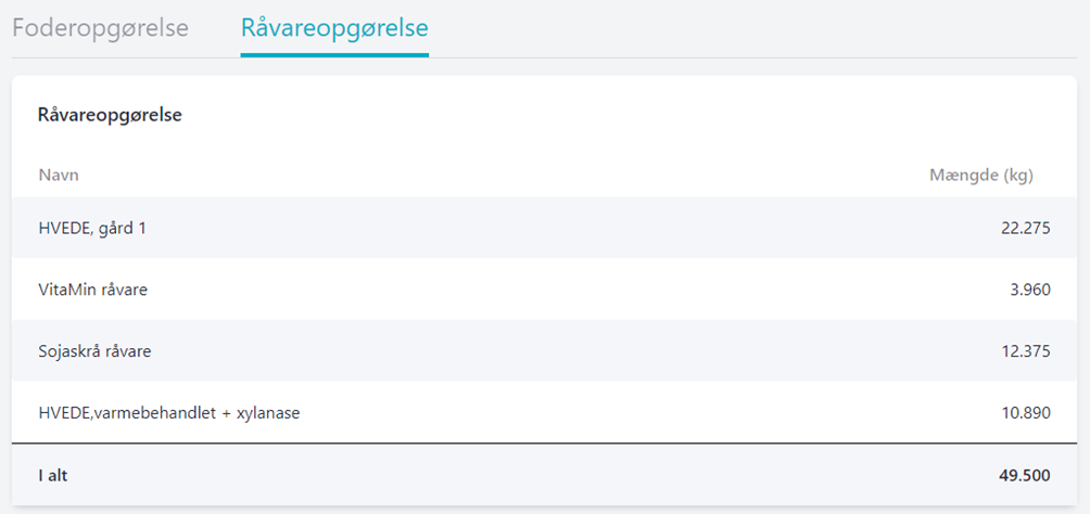 Indtast med hvilken procentdel de enkelte råvarer skal indgå. Total skal give 100%.