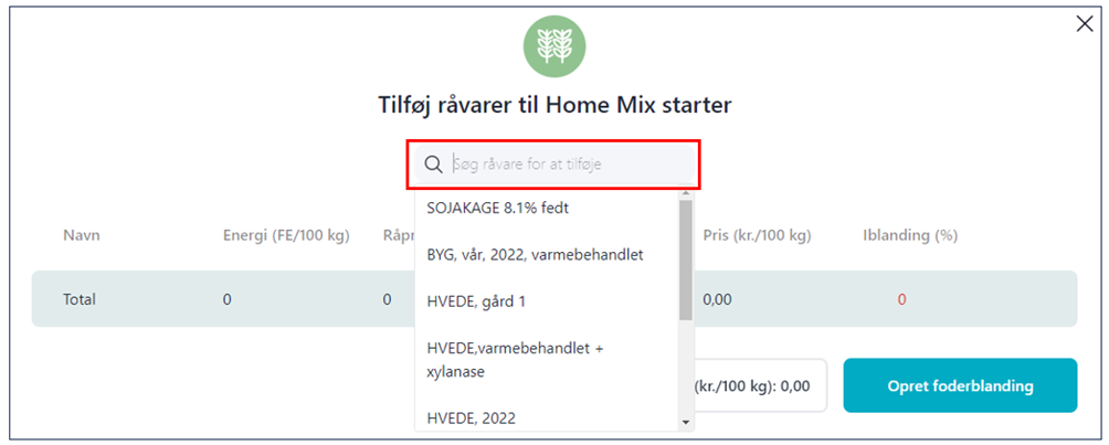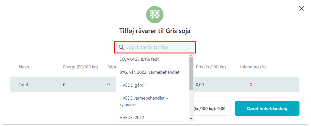 - Når du klikker i søgefeltet, kommer dine registrerede råvarer frem på en liste. Du kan også indtaste navnet i søgefeltet på den råvare, du ønsker at anvende i blandingen