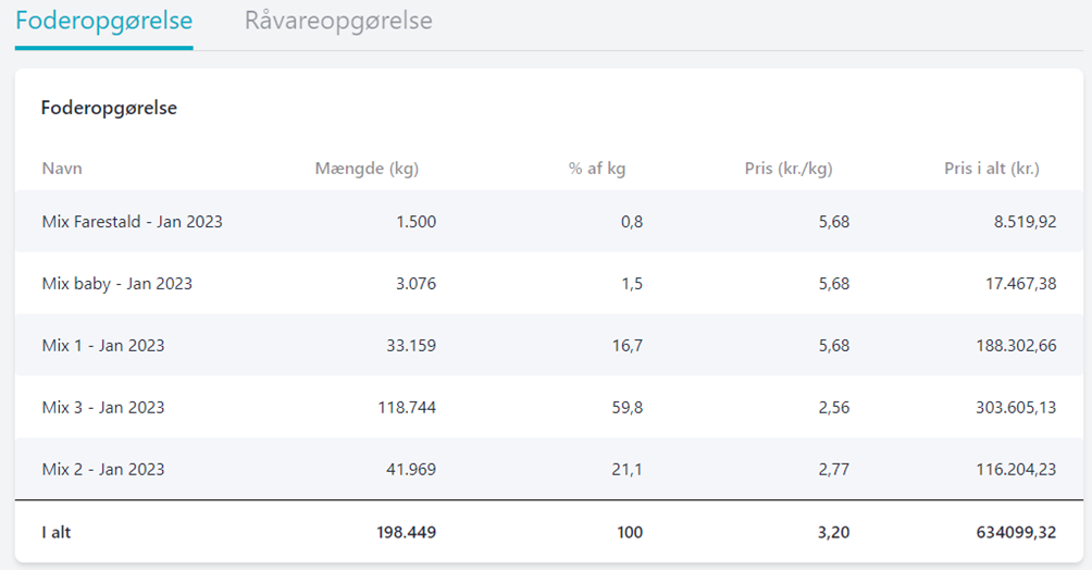 Foderopgørelse viser den samlede mængde, der er brugt i den valgte periode, af:
