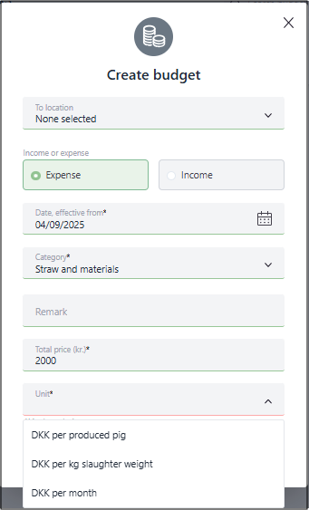 - If the budget lines is placed on a farm, all pigs on that specific CHR number will be charged with the expense/income. If you only want the slaughter pig barn to be affected, place the budget line directly on the slaughter pig barn in the location selector.