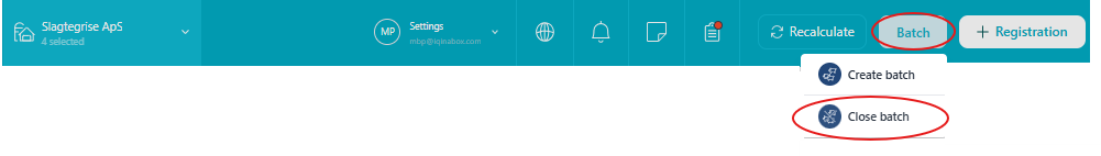 You close your batch by clicking the "Batch" → "Close batch" button in the top right corner of the dashboard.