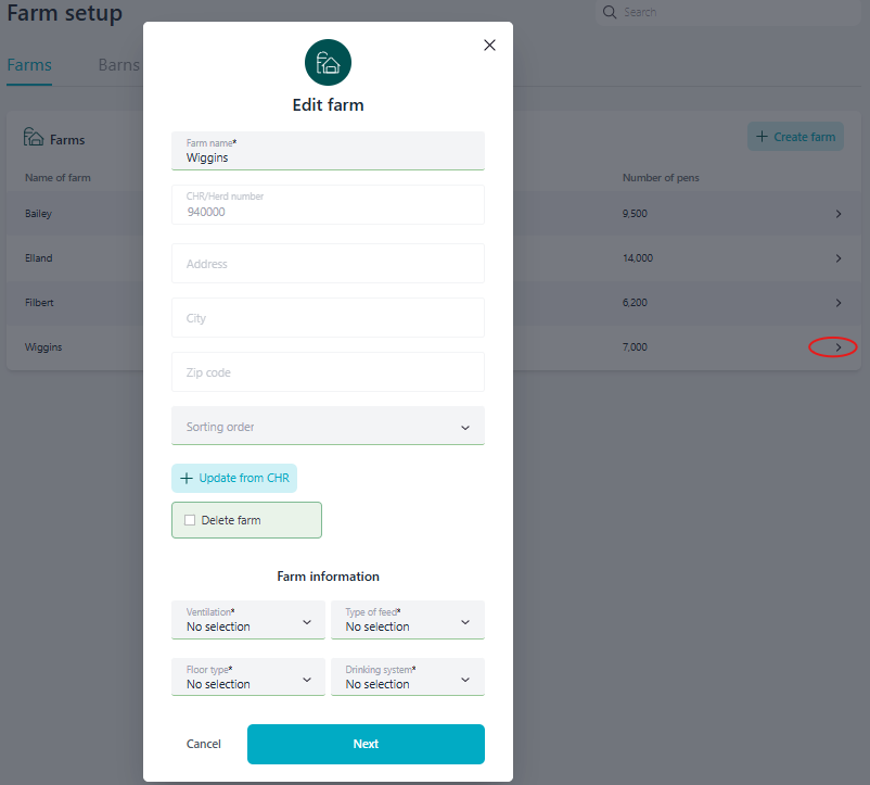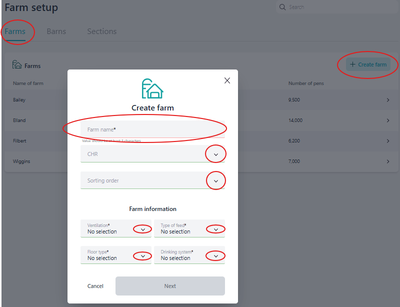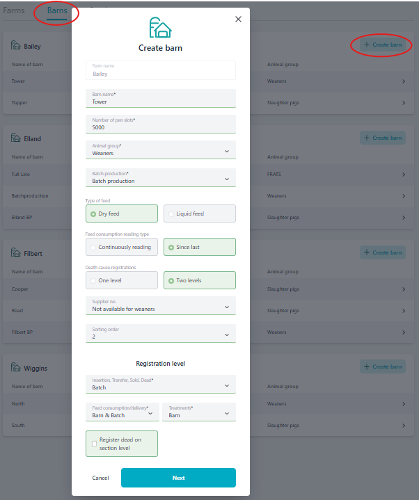 Once all farms are created, click the "Barns" tab to create barns. This requires you to have a connection to your slaughterhouse, see further under the "Setup" menu.