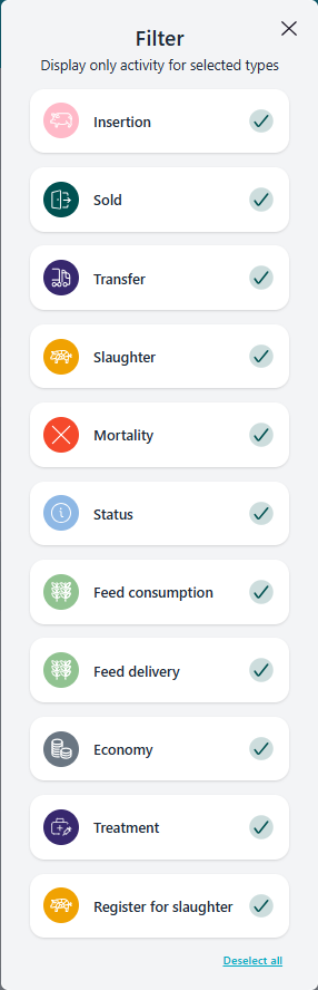 In the log, you can view all the registrations that have been made on your farms, barns, and batches. As with all other pages, data related to either slaughter pigs or weaners will be displayed, depending on what you have selected, as well as for the selected period and locations.