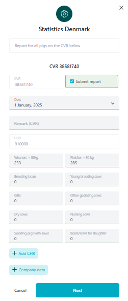 Here, you can report the mandatory quarterly count of pigs. The form shows all CHR numbers registered under the CVR and indicates the number of pigs over and under 50 kg. It is important that you report all your pigs, sows, boars, etc., in the same report. That is, you MUST NOT report weaners and slaughter pigs in PIGS365 and sows in another solution. All pigs on all CHR numbers under the same CVR must be reported together.